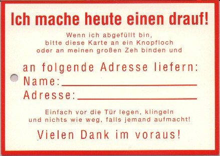 ja, genau BadBoy, sowas aehnliches... bei $freund war das halt "Ich bin betrunken oder Verwirrt, bitte bringen Sie mich nach Hause (oben stehende Adresse)"
