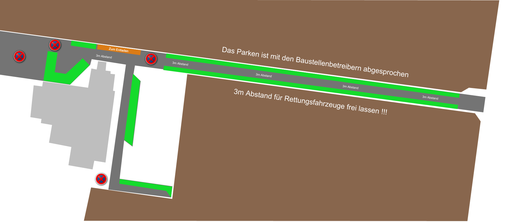 inzwischen haben wir auch die Bestätigung zum Parken vor Ort. In den grün gekennzeichneten Flächen kann geparkt werden. Auf der Zufahrtsstraße ist zwar Halteverbot, allerdings ist das von der Bauetselle aus und mit denen abgestimmt, dort kann zu beiden Seite geparkt werden.