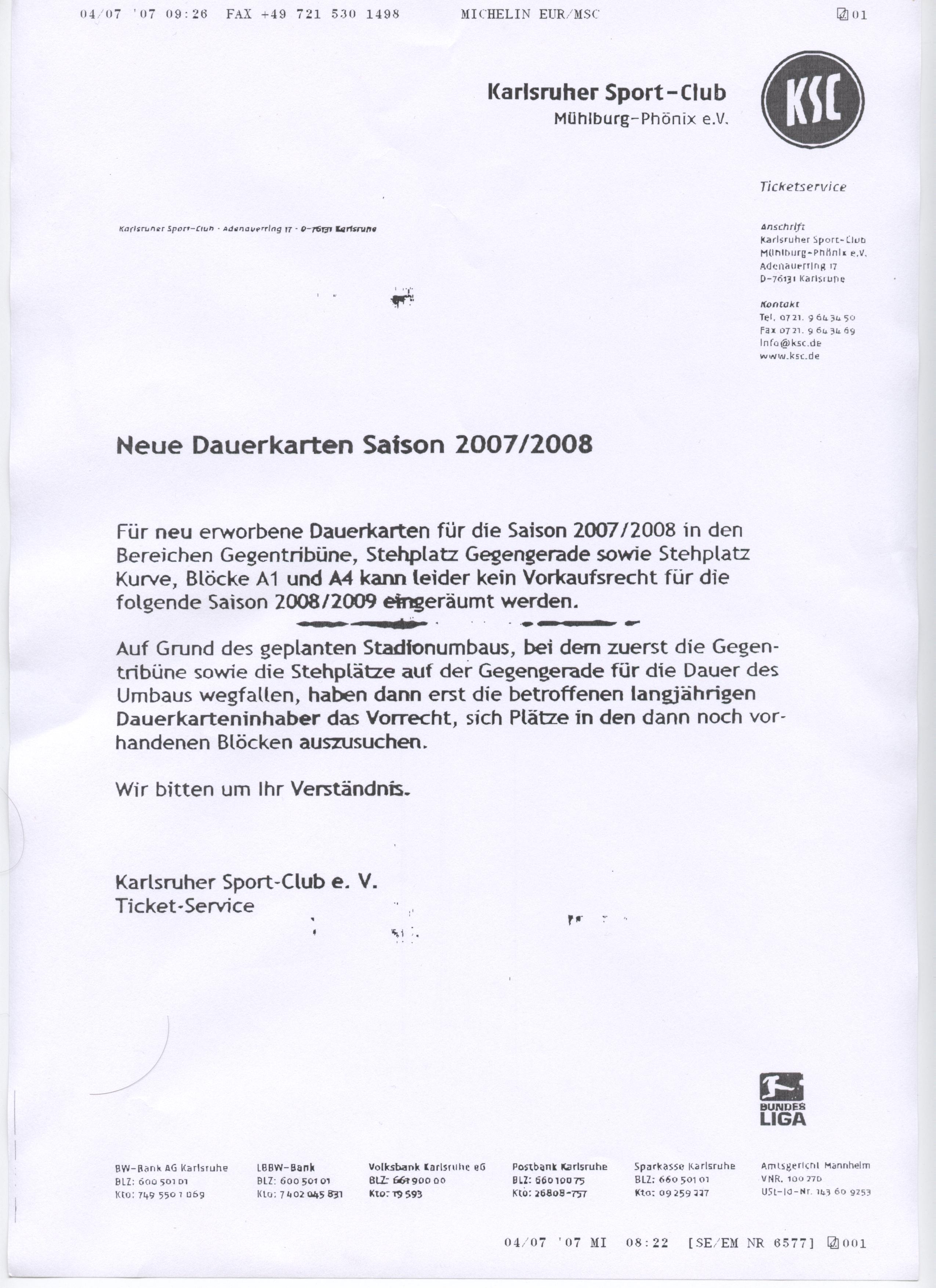 Mein Kollege hat beim Kauf der Dauerkarte einen Zettel mitbekommen wo das drauf steht. Betroffen sind nur anscheinend aber nur diejenigen die erst dieses Jahr ihre Dauerkarte erworben haben. Er bringt ihn morge mal mit, dann schau ich ob ich ihn eincannen kann... |